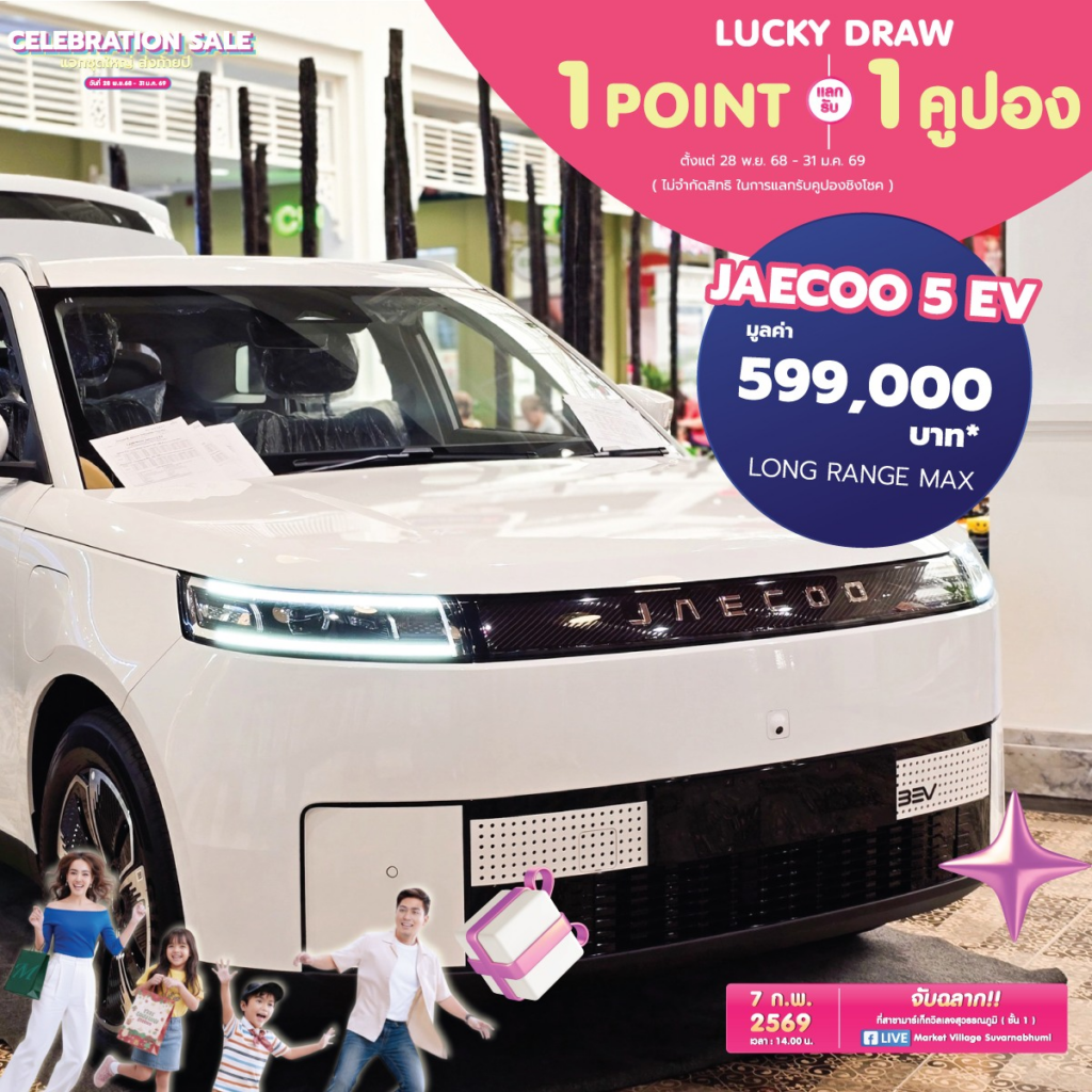 Lucky Draw ลุ้นรถยนต์ ! JAECOO 5 EV (Long Range Max) มูลค่า 599,000 บาท! และของรางวัลอื่นๆอีกมากมาย